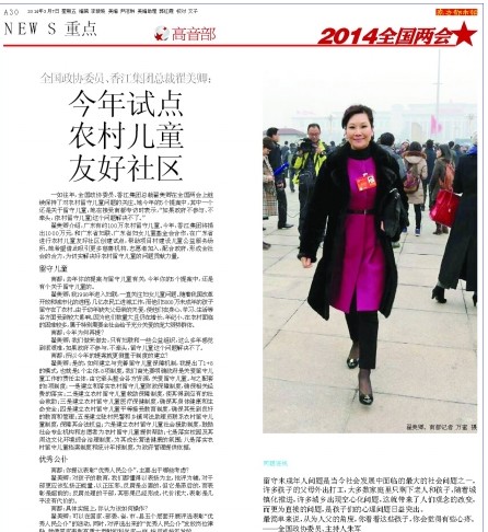 一如往年,全國(guó)政協(xié)委員、香江集團(tuán)總裁翟美卿在全國(guó)兩會(huì)上繼續(xù)保持了對(duì)農(nóng)村留守兒童問(wèn)題的關(guān)注。她今年的5個(gè)提案中,其中一個(gè)還是關(guān)于留守兒童,她在接受南都專訪時(shí)表示,“如果政府不參與、不牽頭,(農(nóng)村留守兒童)這個(gè)問(wèn)題解決不了!