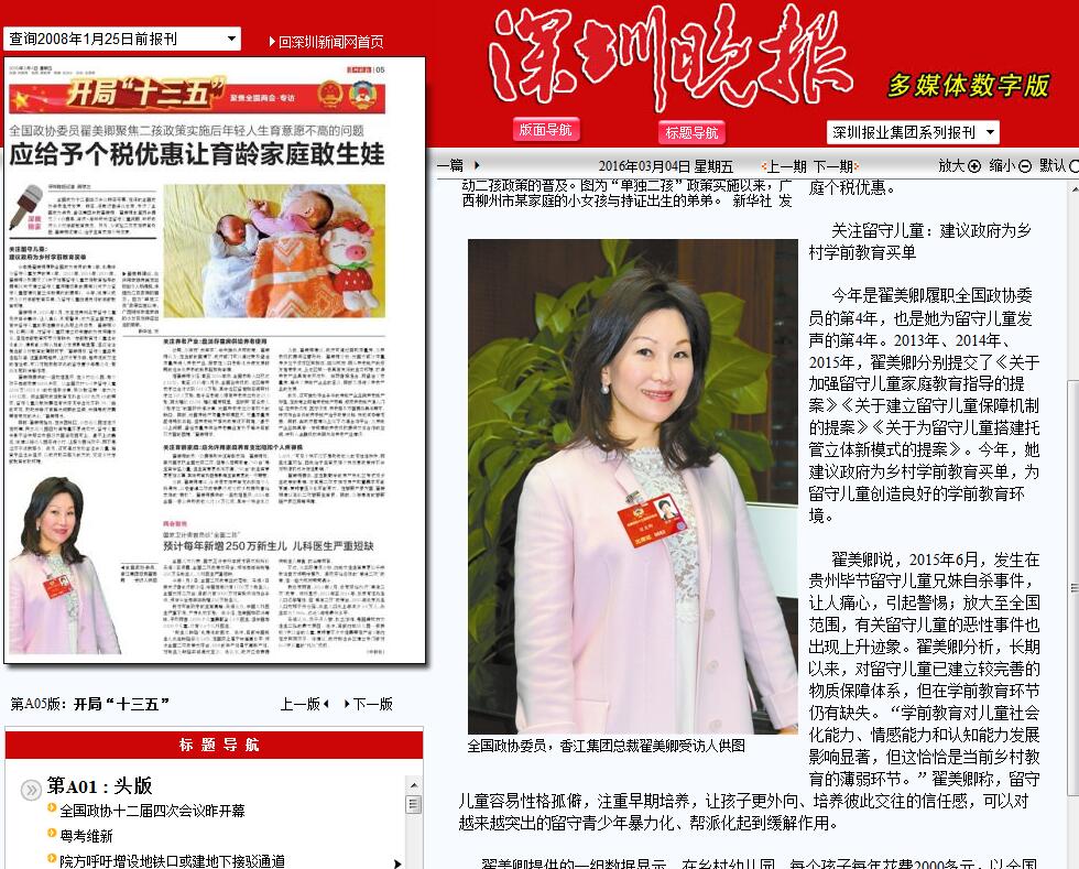 全國(guó)政協(xié)十二屆四次會(huì)議昨日開(kāi)幕,在深的全國(guó)政協(xié)委員繼續(xù)發(fā)聲。昨日,深晚記者連線北京,專(zhuān)訪了全國(guó)政協(xié)委員、香江集團(tuán)總裁翟美卿。翟美卿本屆兩會(huì)提交了4份提案,連續(xù)4年呼吁關(guān)注留守兒童問(wèn)題,呼吁政府為鄉(xiāng)村學(xué)前教育兜底。另外,為減輕二孩家庭養(yǎng)育負(fù)擔(dān),翟美卿還建議,給予生育家庭個(gè)稅優(yōu)惠。