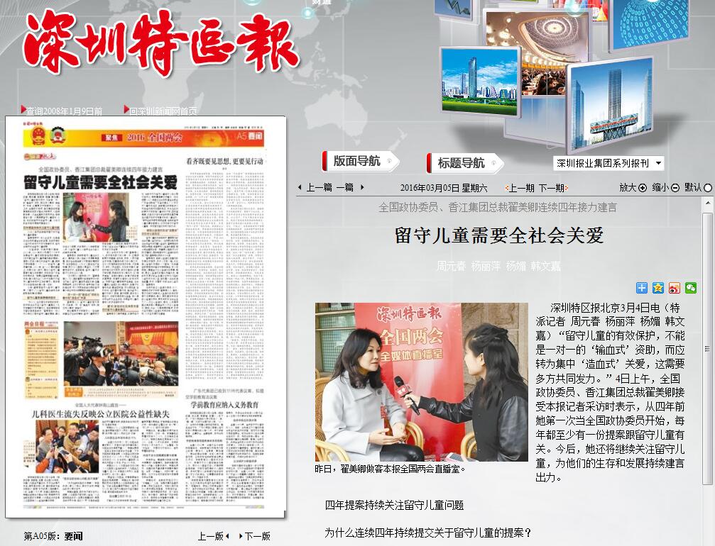 翟美卿表示,作為企業(yè)家,也是香江社會(huì)救助基金會(huì)的主席,她在平常的公益行動(dòng)中與農(nóng)村孩子接觸較多,自然會(huì)持續(xù)關(guān)注留守兒童問(wèn)題。
